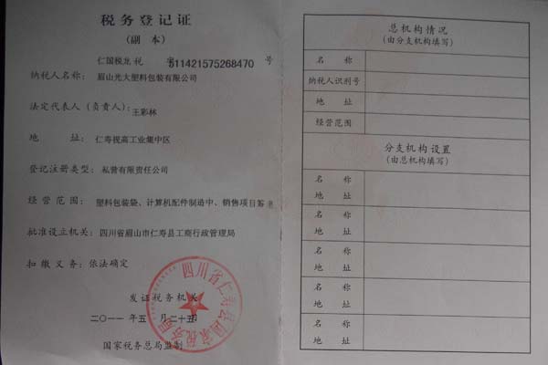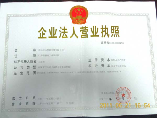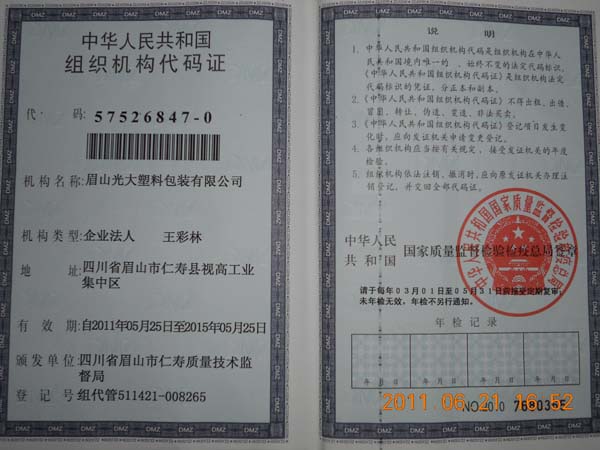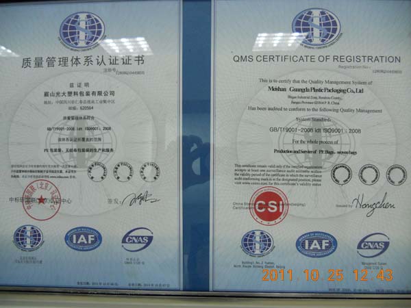 眉山光大塑料包裝有限公司通過了ISO9001和SO14001質量體系認證